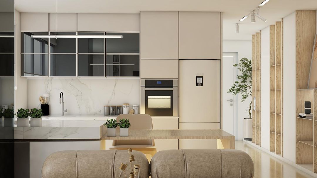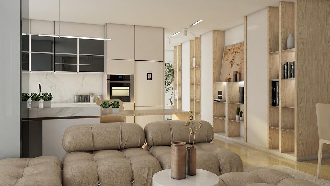 In this living room, beige reigns supreme, creating a serene and harmonious ambiance. The walls are painted in a gentle shade of beige, casting a soothing spell over the entire room. Soft sunlight filters through beige curtains, casting a gentle glow that complements the room’s natural tones.